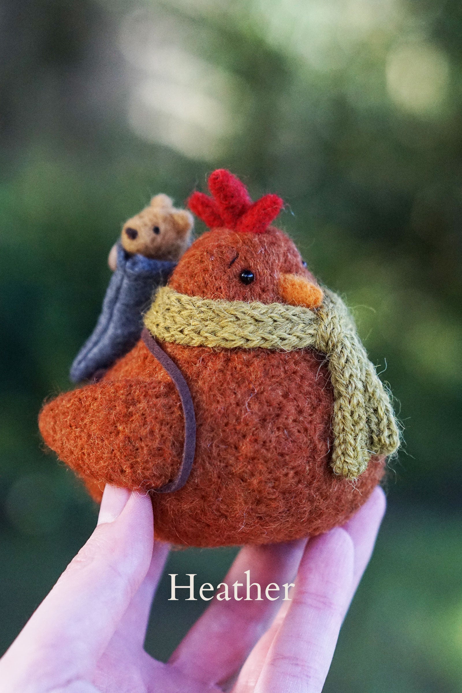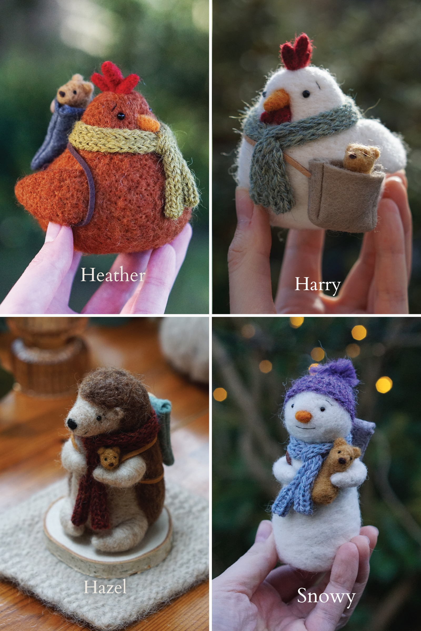 They each wear a little knitted scarf or hat and carry a felt rucksack with leather straps and their very own miniature needle felted teddy tucked inside. All items are unfixed, so rucksack, teddy and scarf can be taken off/put back on.