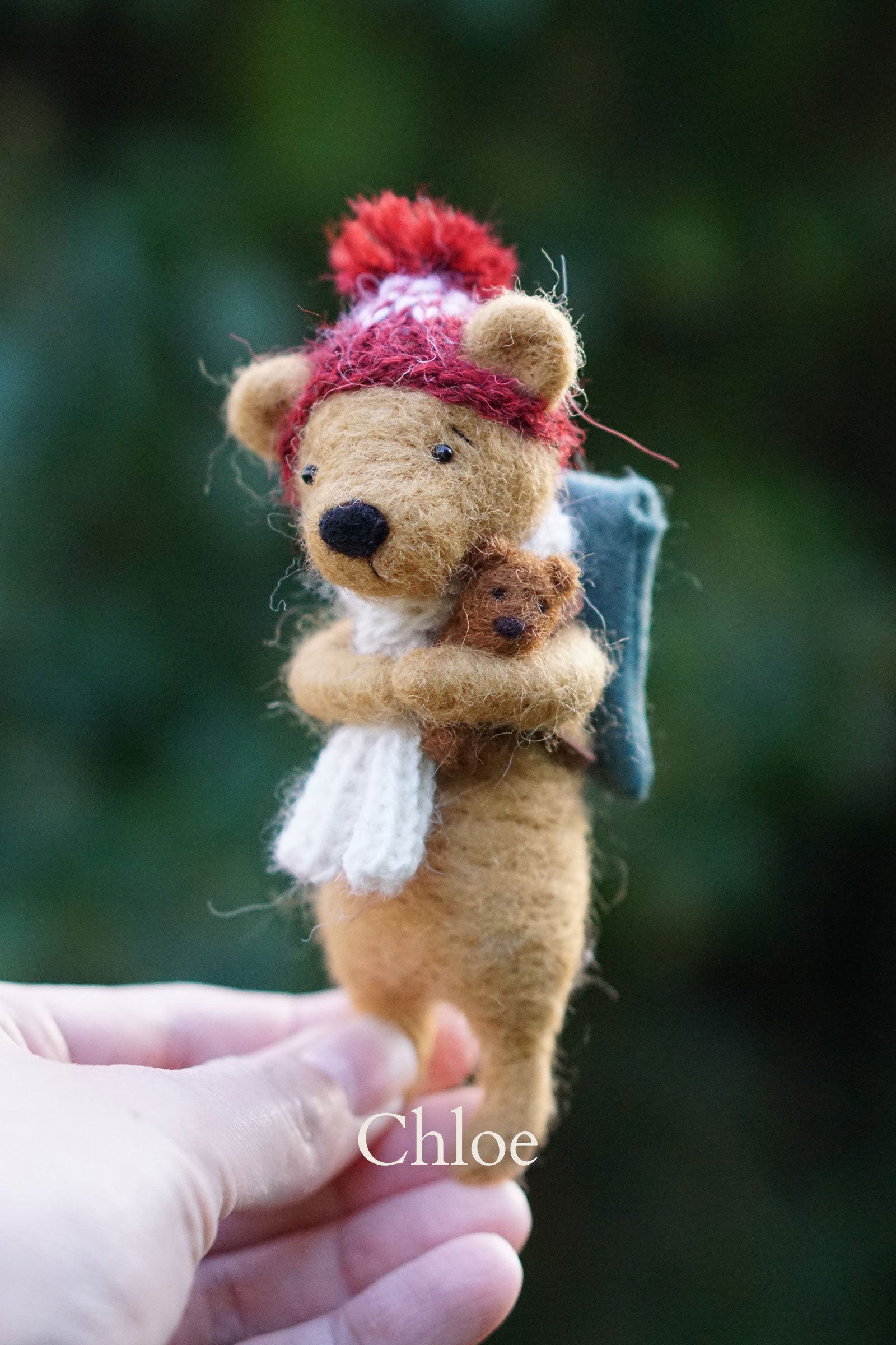 They each wear hand knitted knitwear and carry a felt rucksack with leather straps and their very own miniature needle felted teddy tucked inside.