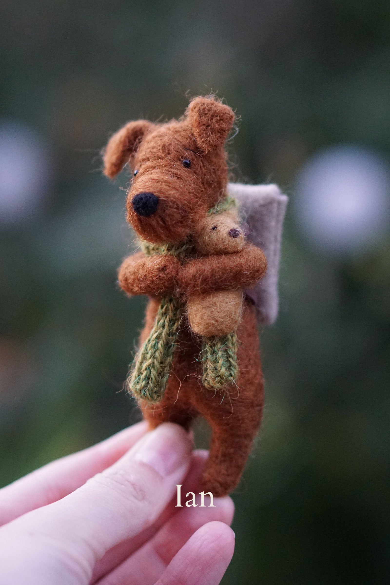 They each wear a little knitted scarf and carry a felt rucksack with leather straps and their very own miniature needle felted teddy tucked inside. All items are unfixed, so rucksack, teddy and scarf can be taken off/put back on.