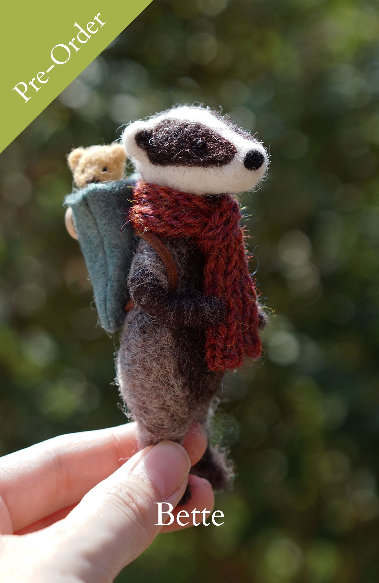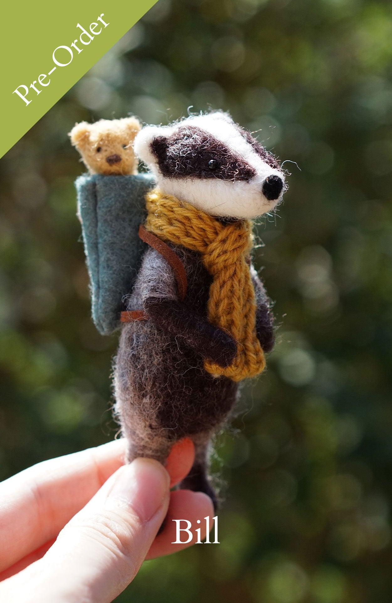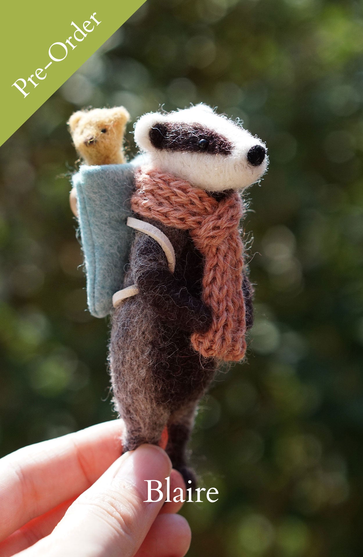These little badgers are made out of wool using the dry needle felting process. They stand at approximately 11cm tall from the bottom of their paws to the tips of their ears.